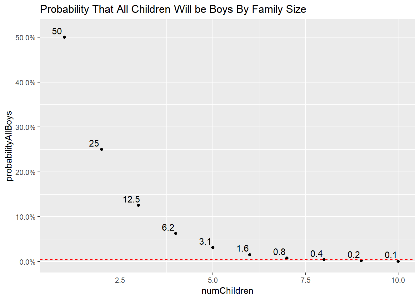 ggtitle("Probability That All Children Will be Boys By Family Size")